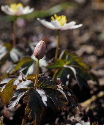 Die Anemone ‚Dark Leaf’ würde von Endre Földesi gefunden und zeichnet sich insbesondere durch ihren dunklen Austrieb aus. Die schwarzbraunen Blätter werden und bleiben insbesondere bei sonnigeren Standorten sehr dunkel. Die Blüten sind weiß und bekommen zum Ende der Blütezeit einen rosafarbenen Hauch. Anemone nemorosa ‚Dark Leaf’ ist ein kleines und zartes Buschwindröschen und wächst zwar zurückhaltend, aber stetig. Auch die Höhe von nur 10 cm unterstreicht die spezielle Aura der Sorte. Ansonsten aber genauso unverwüstlich wie die anderen Buschwindröschen.