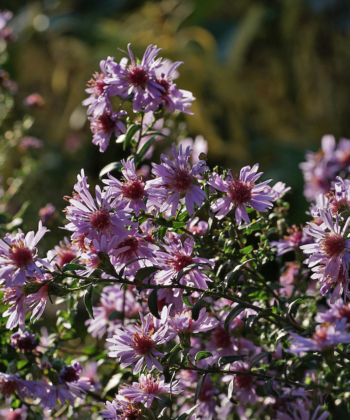 Bereits vor Jahren begannen unsere Experimente neue gartenwürdige Astern aus Asternwildarten zu entwickeln. Hierzu wurden verschiedene Kreuzungen durchgeführt und die neuen Hybriden auf Herz und Nieren geprüft. Einige von ihnen haben von uns einen Sortennamen bekommen. So auch die Aster x ‘Nyx’. Sie ähnelt einerseits den dunkellaubigen Sorten der Aster laevis, man denke an ‘Calliope’ und Glow in the Dark’. Denn auch Aster ‘Nyx’ hat schwarzviolett überhauchte Blätter und Stängel. Andererseits besitzt sie die hervorragende Eigenschaft horstig zu wachsen, wodurch sie sich fundamental von den beiden zuerst genannten Sorten unterscheidet. Auch ist der Wuchs im Vergleich deutlich gedrungener. Aster ‘Nyx’ wird 90–110 cm hoch und besitzt Triebe, die in alle Richtungen, elegante, bogige Seitentriebe machen. Diese sind ab Ende September mit unzähligen hell rosavioletten Blüten besetzt. Die Blütenmitte ist gelb und färbt sich, während sich die Blüte öffnet, nach rosa, was den Blüten ihren ganz eigenen Flair gibt. Sie sollte sonnig bis halbschattig gepflanzt werden. Die Sorte für Orte an denen die alten Aster laevis-Auslesen zu starkwüchsig und groß sind.