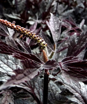 Septembersilberkerze sind die Blätter, wie bei der Stammform, mehrfach gefiedert und erinnern im Austrieb ein wenig an Paeonia lactiflora. Das schwarzrot überlaufende Laub selbst wird etwa 80 cm hoch und eignet sich wunderbar um Kontraste zu schaffen, wie z.B. mit großen gelb- oder blaulaubigen Hostas. Ein wenig Sonne hilft die Ausfärbung der Blätter zu intensivieren. Dabei sollte man aber beachten, dass der Standort nicht zu sonnig wird, da es sonst schwer wird die geforderte gleichmäßige Bodenfeuchte zu erhalten. Die Blütenknospen sind bis zur Blüte im September kleine Knöpfe und entfalten sich erst dann zu den weißen Blütentrauben. Diese besitzen einen sehr starken Maiglöckchenduft, der regelrecht durch den Garten wabbert. Der Boden sollte locker humos sein. Samensorte dadurch etwas variabel. Mit Blüte etwa 120 – 150 cm hoch und 50 cm breit.